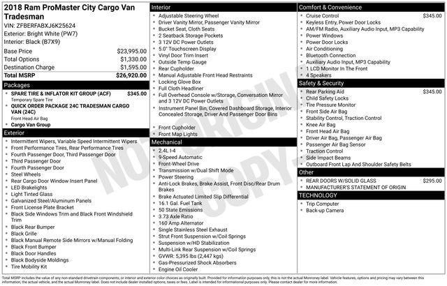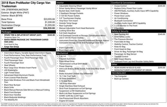 This 2018 Ram ProMaster City Tradesman offers an impressive array of features that make it an exceptional choice for your transportation needs. Boasting a 2.4L I4 MultiAir engine paired with a 9-Speed 948TE Automatic transmission, this van delivers a smooth and efficient driving experience with an impressive 21 city / 28 highway MPG.