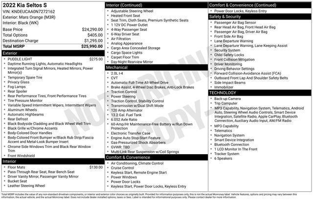 Boasting a 2.0L I4 MPI engine and AWD, this Seltos S delivers an exceptional blend of power and efficiency, with an EPA-estimated 27 city/31 highway MPG. The spacious interior and versatile cargo area make it the perfect companion for your daily commute, weekend adventures, and everything in between.
