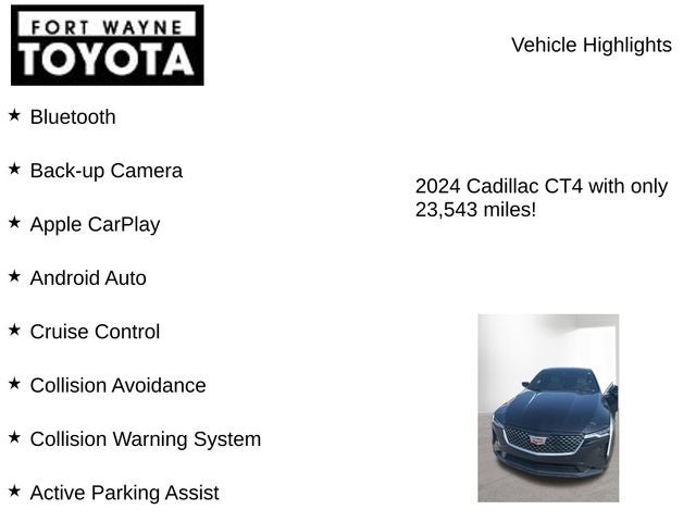 Experience the pinnacle of modern luxury in this 2024 Cadillac CT4 Premium Luxury. With its cutting-edge technology, premium amenities, and dynamic driving dynamics, this vehicle is sure to exceed your expectations. Schedule a test drive today and discover the difference that Fort Wayne Toyota's commitment to excellence can make.