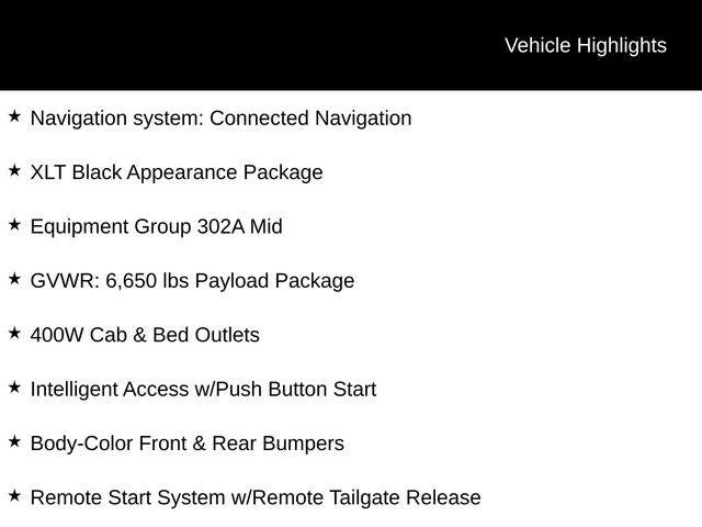This F-150 XLT also comes equipped with the Equipment Group 302A Mid, which includes a host of premium features like a navigation system, 400W cab and bed outlets, and Intelligent Access with Push Button Start. The XLT Black Appearance Package adds a touch of style with its black exterior accents and unique interior details.